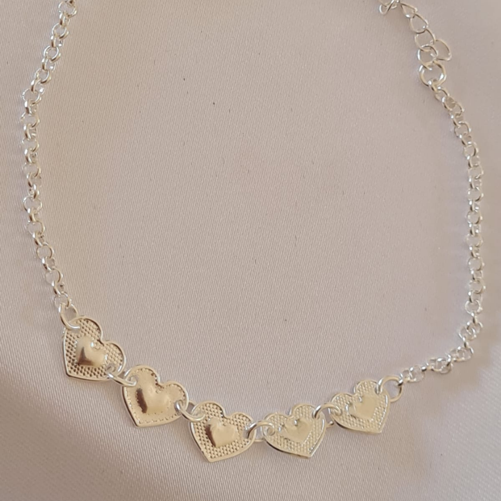Essa pulseira traz uma sequência encantadora de corações texturizados, conectados por elos delicados, formando um símbolo contínuo de amor e beleza.